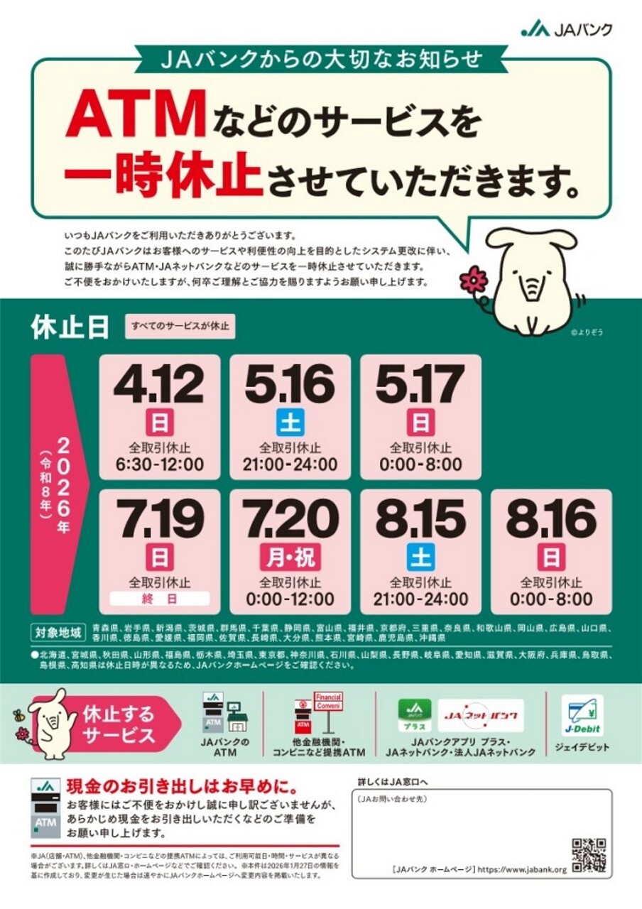 JAバンクアプリ プラスに関する規定に係る改正を令和8年4月20日(月)に予定しています。具体的改正内容等については、令和8年3月19日(木)以降にJAバンクアプリプラス特設ページ